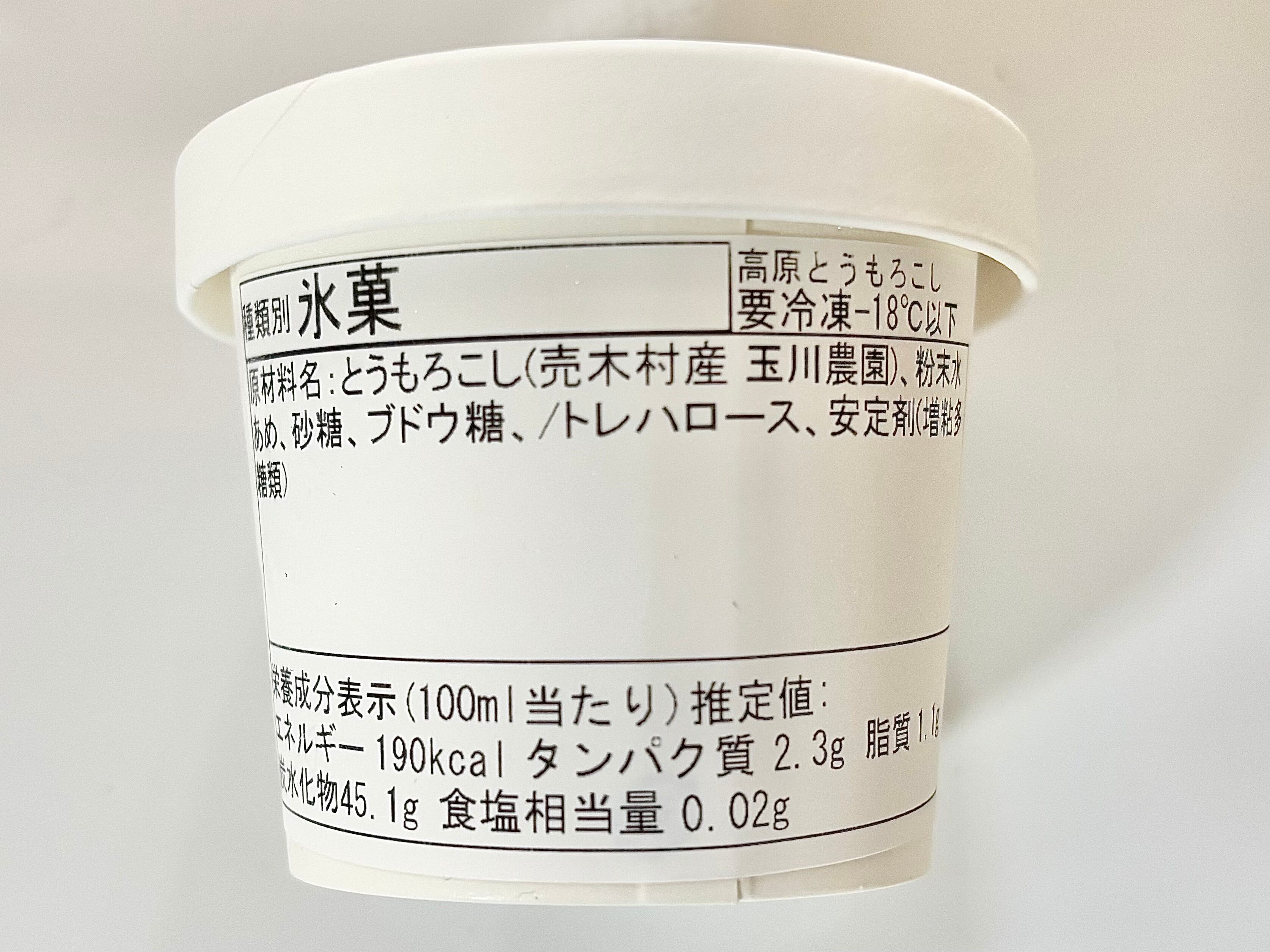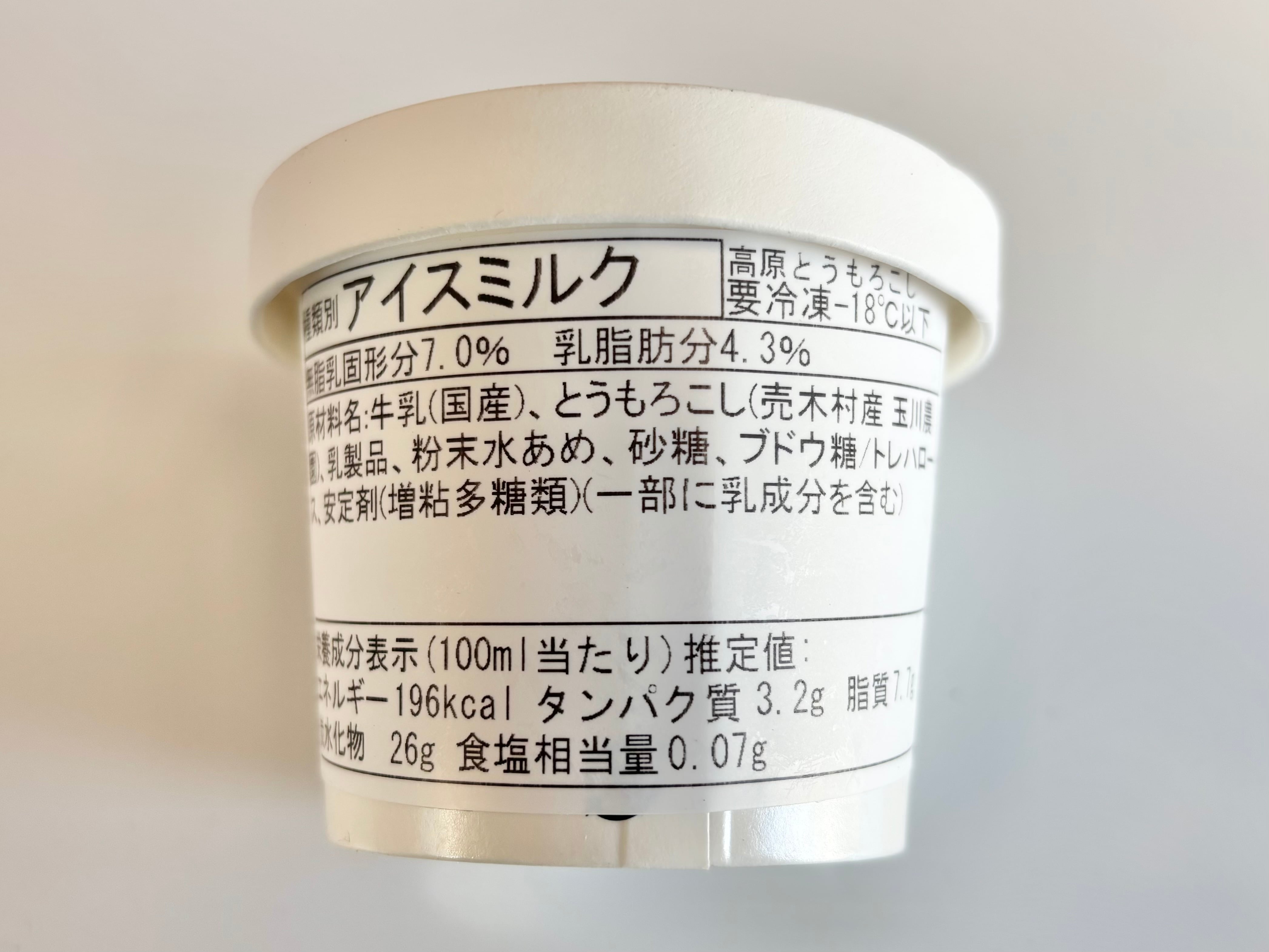 原材料:牛乳(国産)、とうもろこし(長野県下伊那郡売木村産 玉川農園)、乳製品、粉末水あめ、砂糖、ブドウ糖、/トレハロース、安定剤